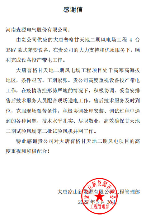 近日,bbv体育注册收到大唐凉山新能源有限公司发来的感谢信,对bbv体育注册提供优质服务,助力项目并网表示感谢。